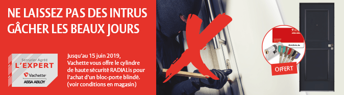Jusqu’au 15 juin 2019, Atelier Toulousain de Protection votre serrurier agréé l'Expert Vachette à Toulouse vous offre le cylindre de haute sécurité RADIALis pour l’achat d’un bloc-porte blindé Vachette.